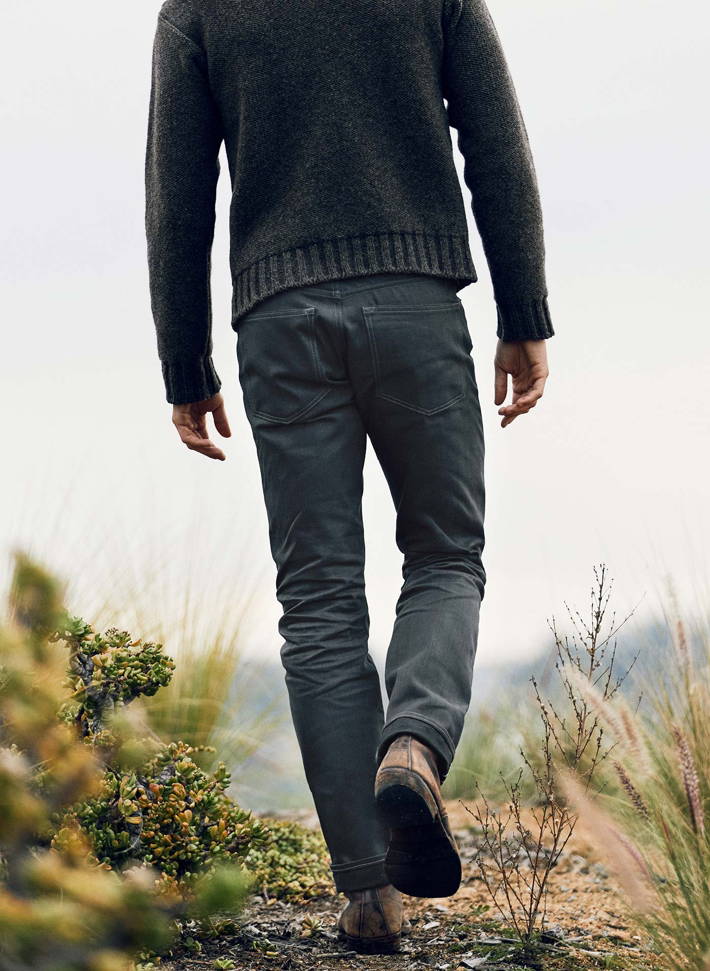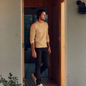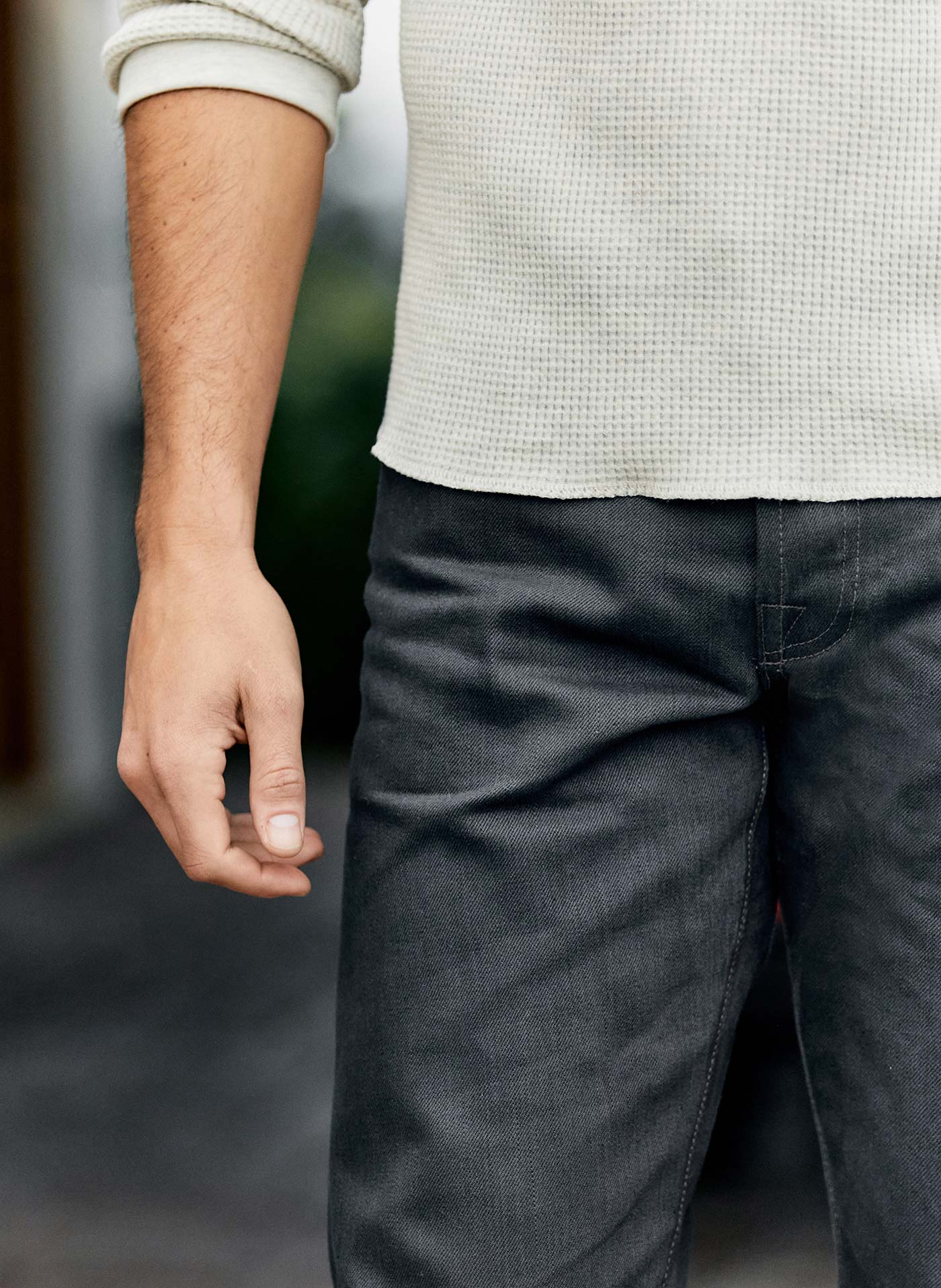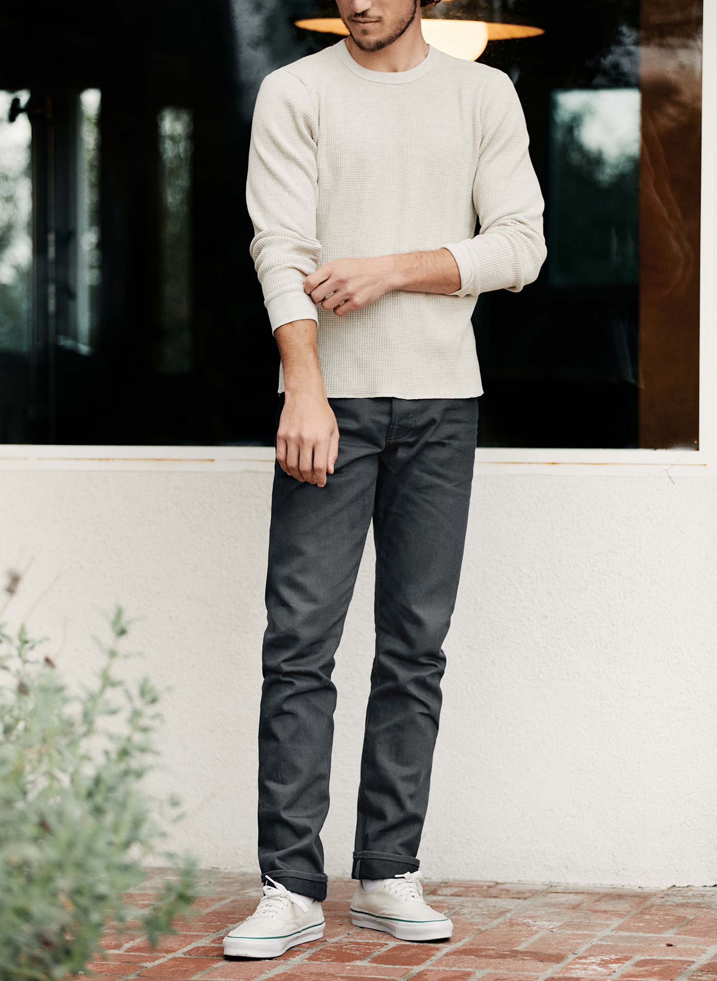 barton sits right on the hips and is slim through the thigh and knee.