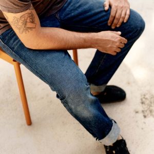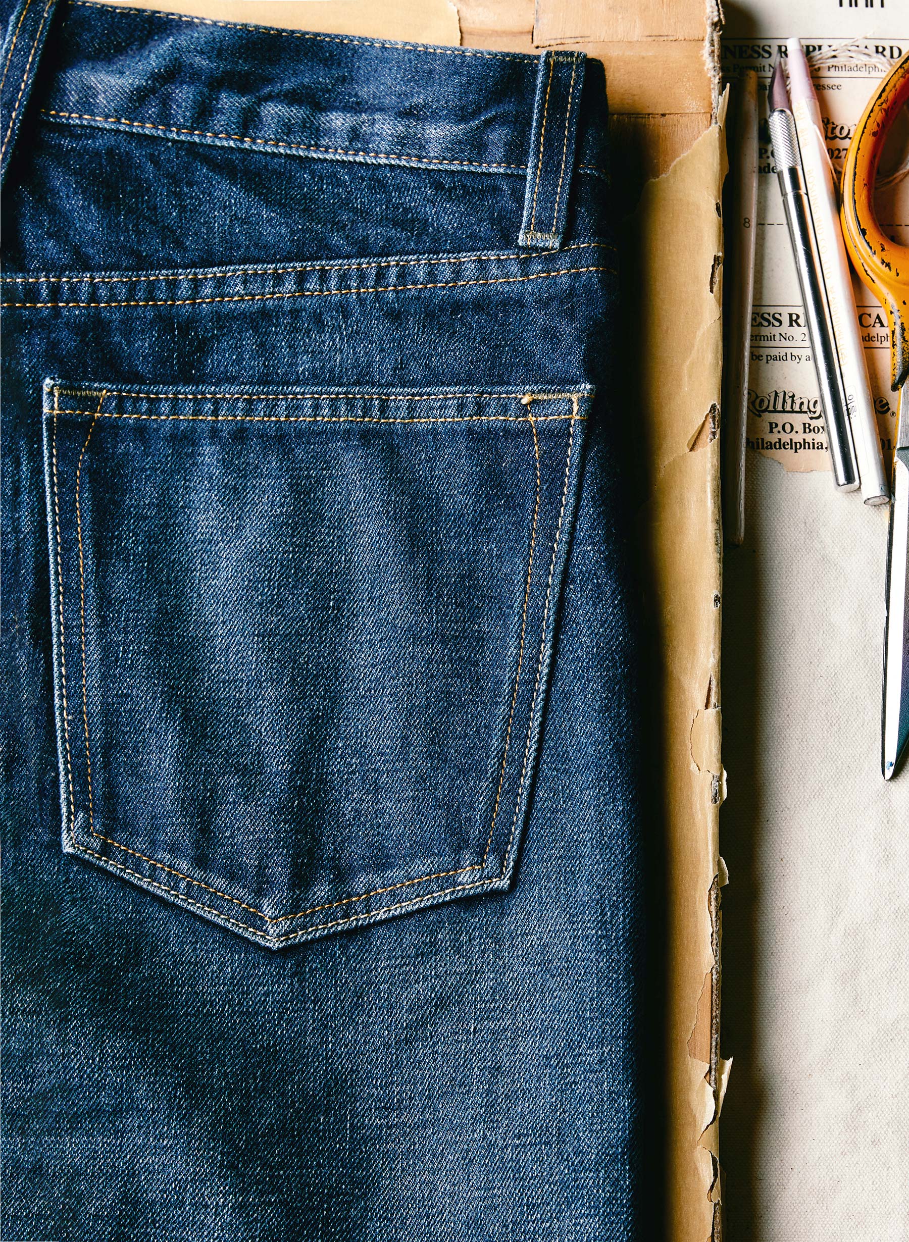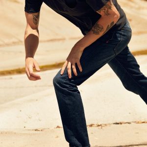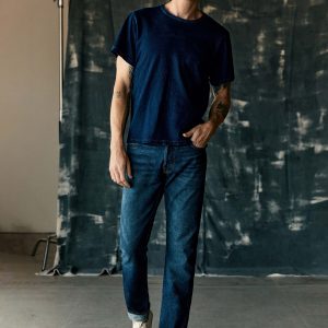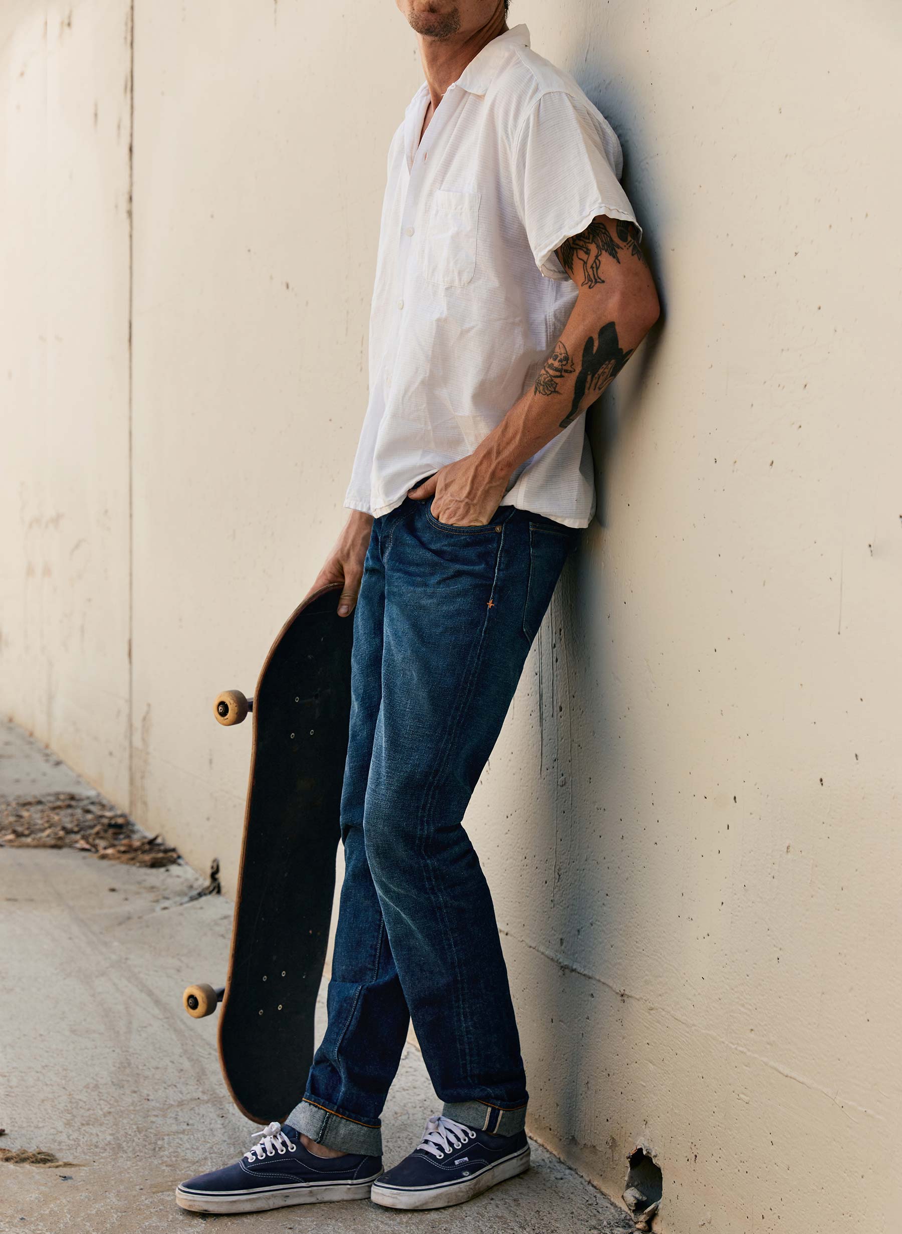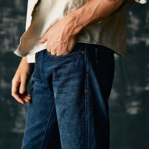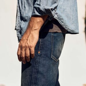 barton sits right on the hips and is slim through the thigh and knee.