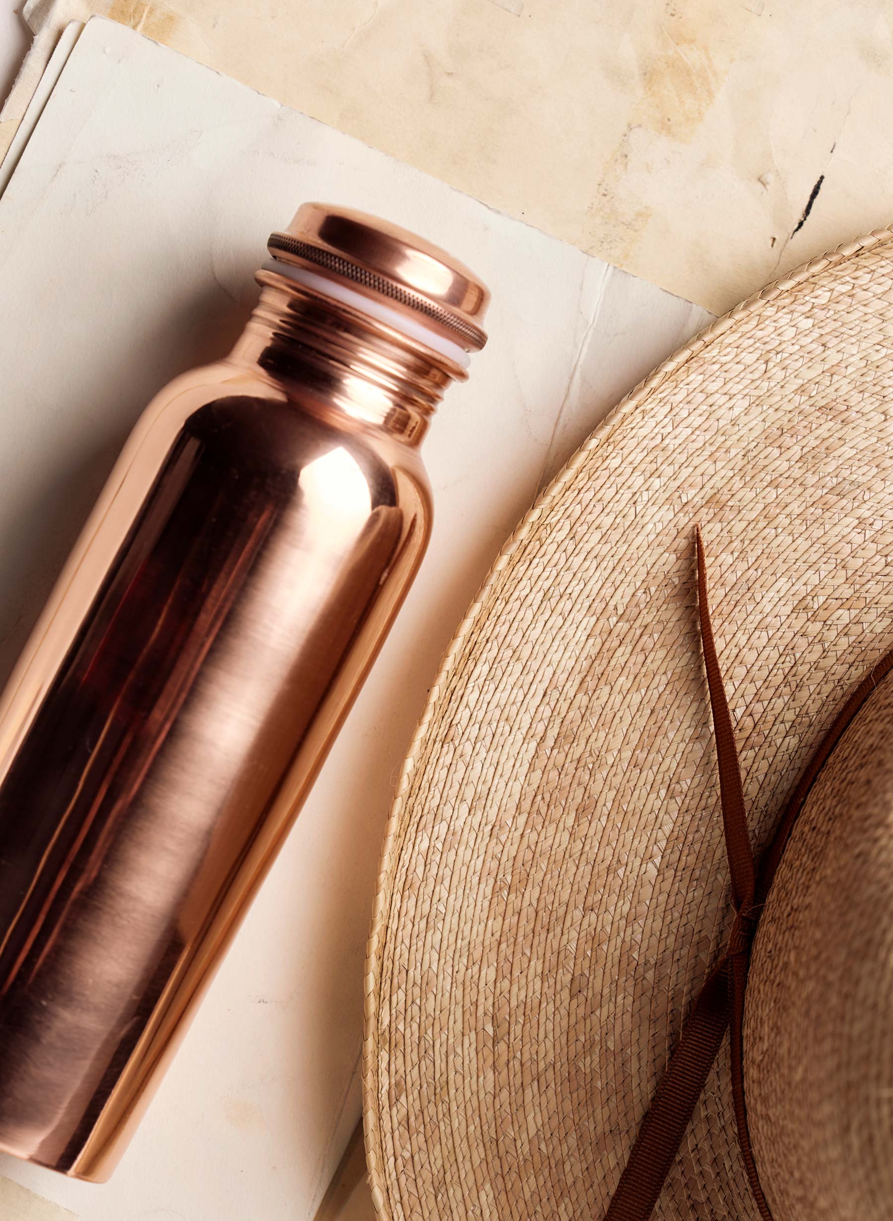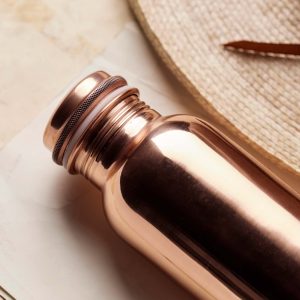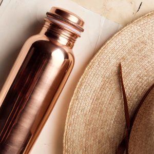 drink more water. use less plastic. this reusable water bottle from our friends at El Cosmico in Marfa. TX not only benefits our planet. but copper naturally ionizes the water over time. and causes the water to become alkaline.
