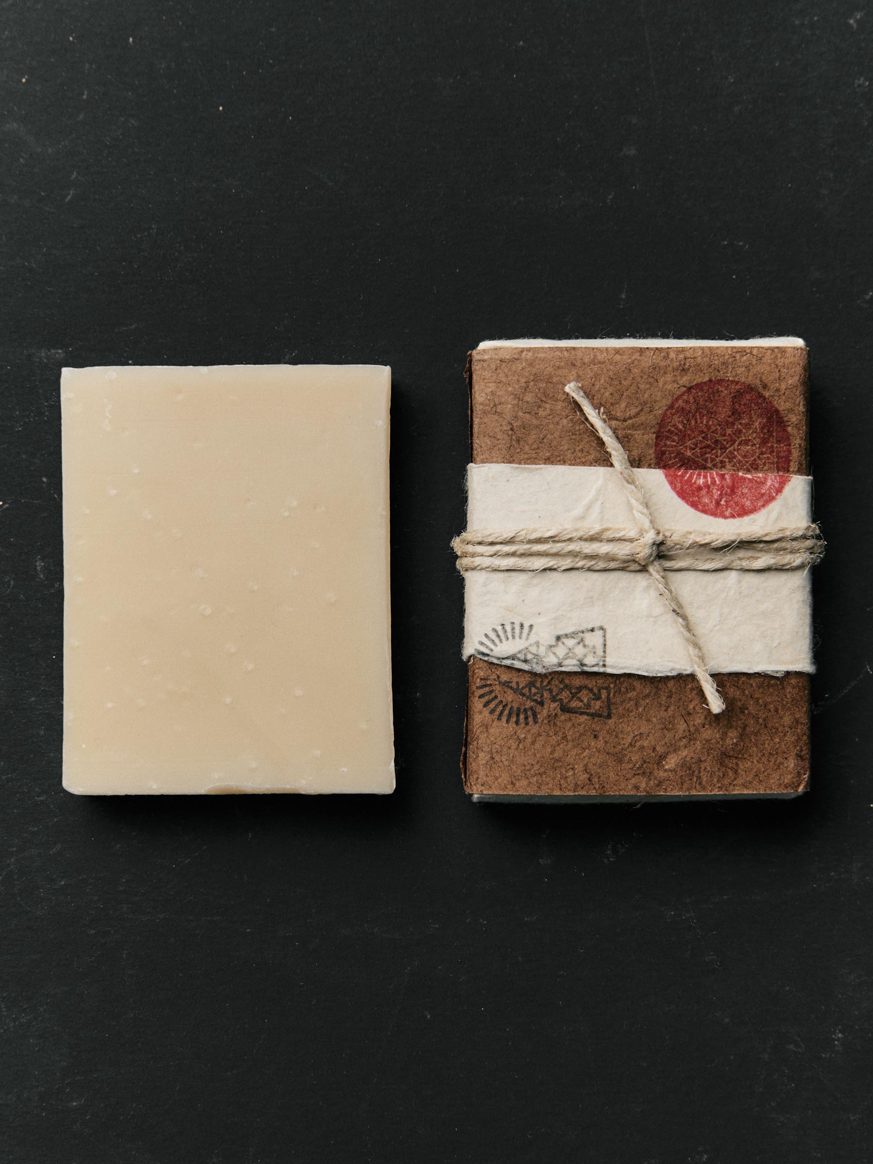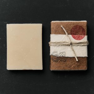 resembling an herbal sauna. this soap blends 15 different oils into a small batch cold processed vegan soap bar. which is then hand wrapped with Traditional Nepalese Lokta paper.