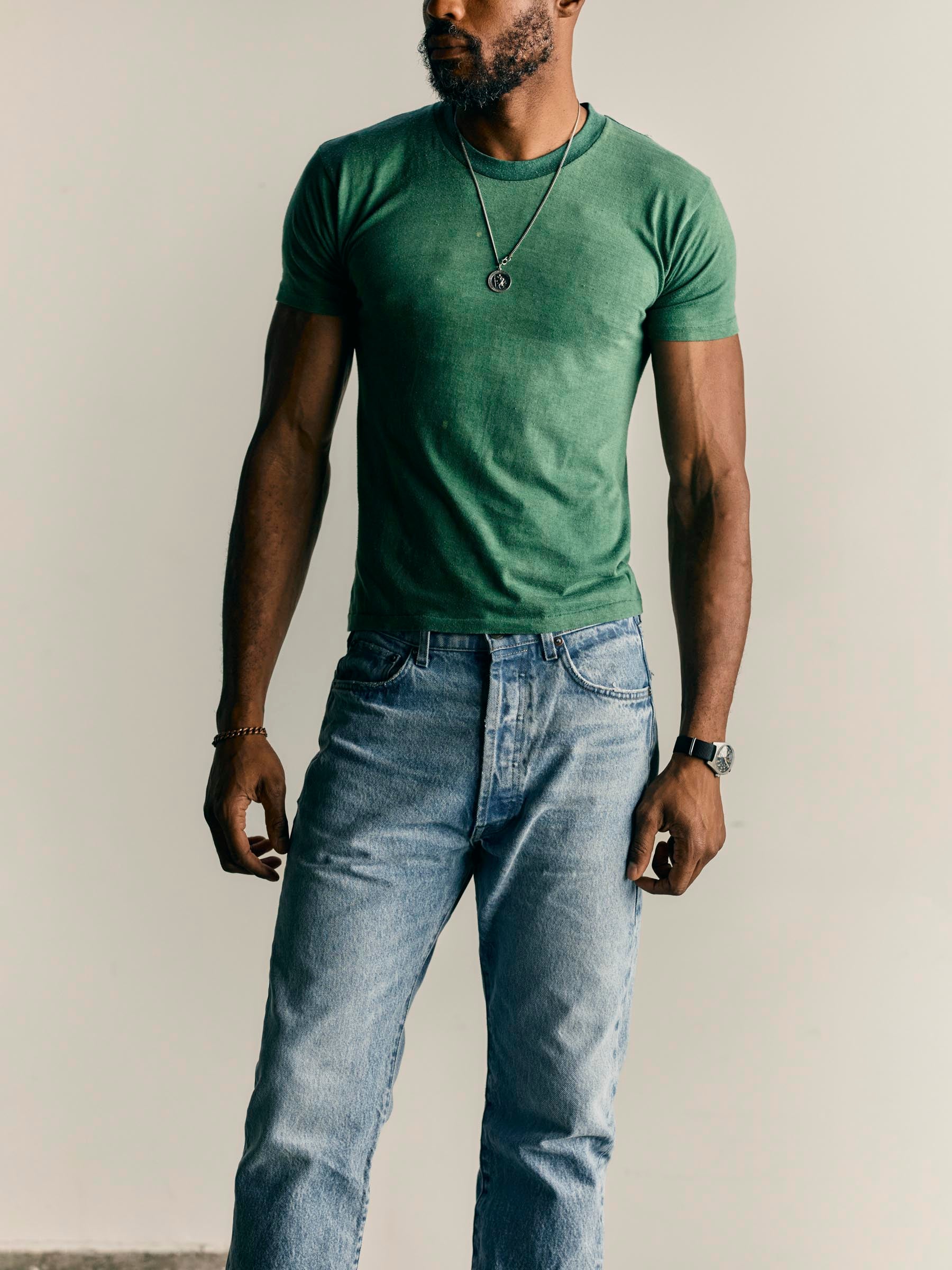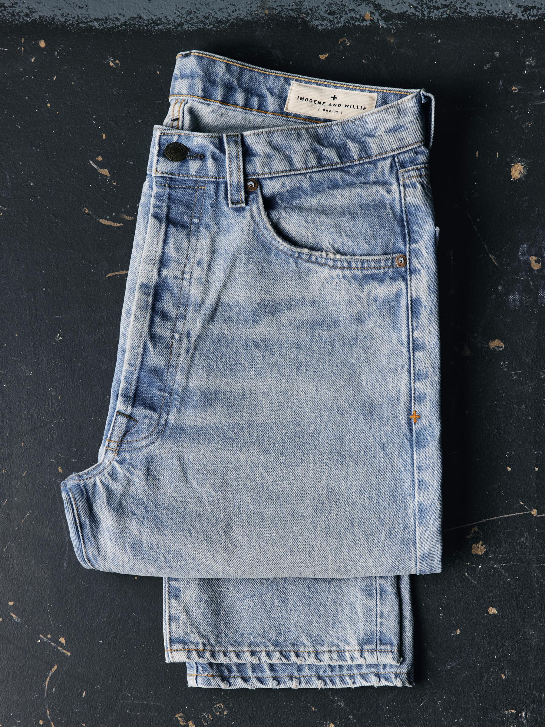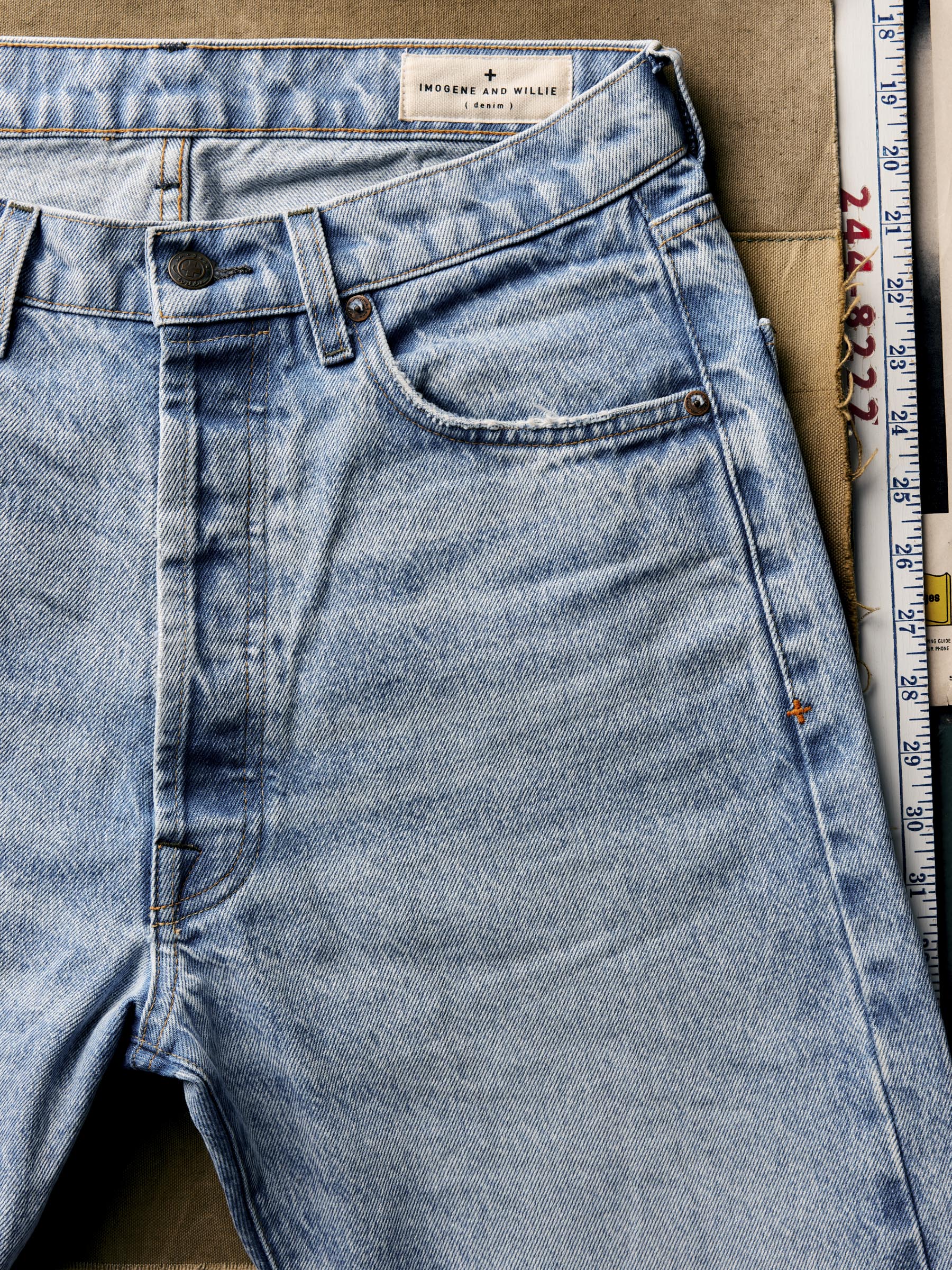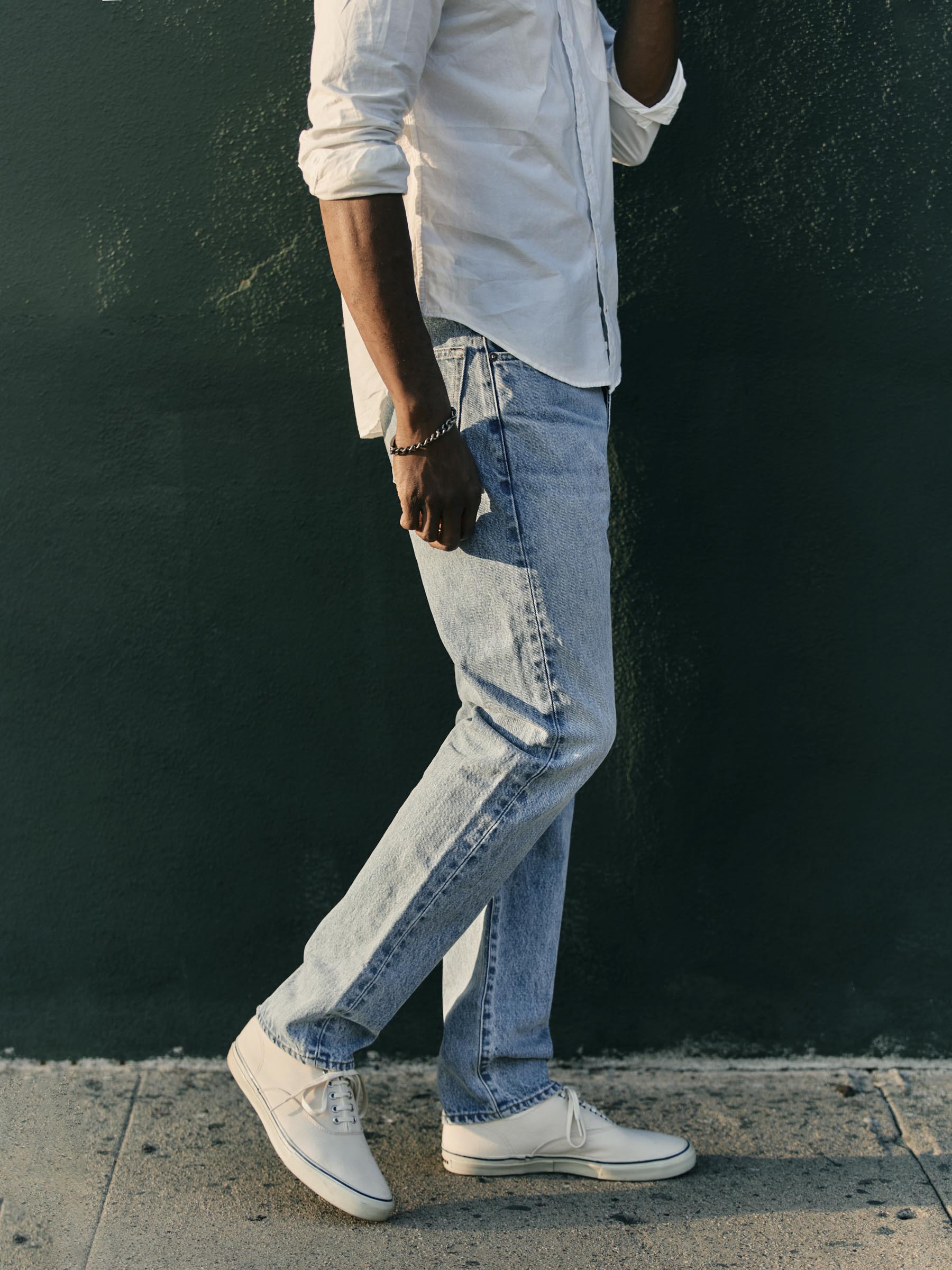 sitting right on the hips with a roomy top block. Russell has an easy fit with just the right amount of slouch. then ends in a less gradual taper that cuts quickly to the leg opening.