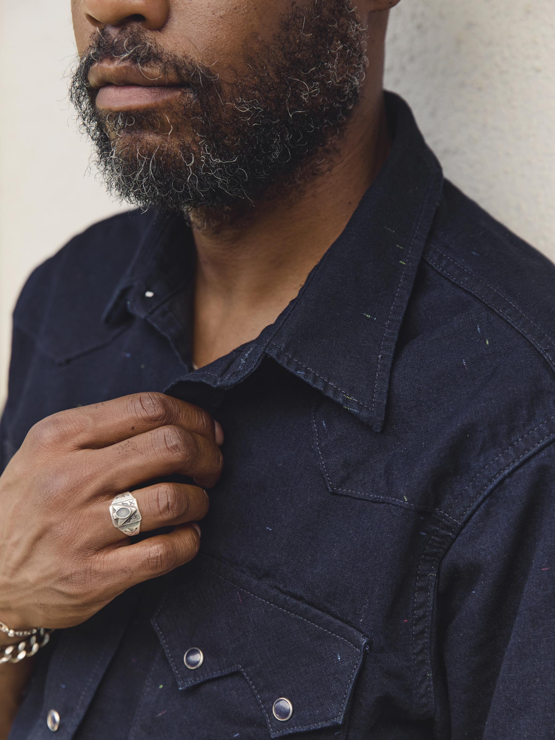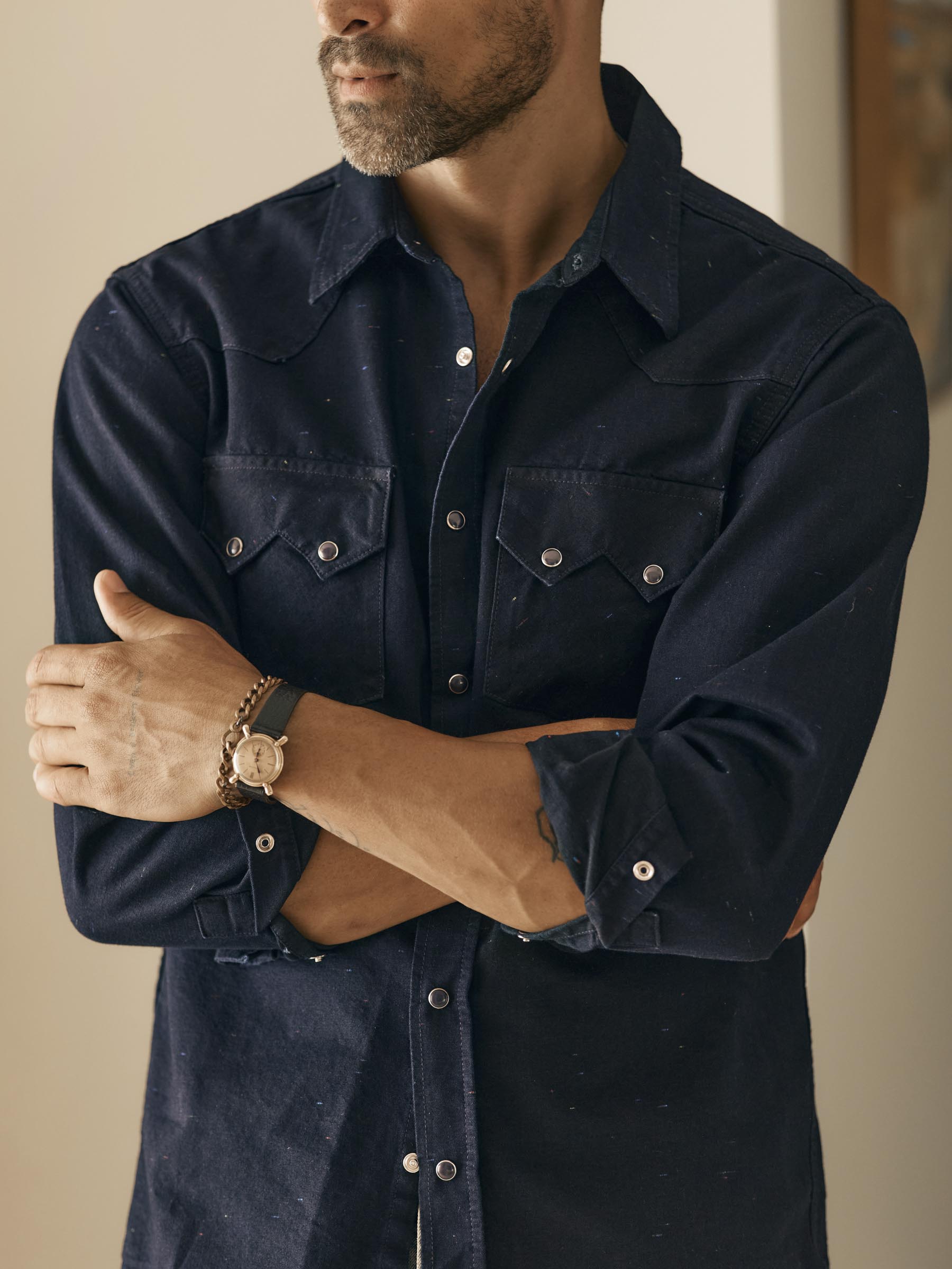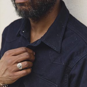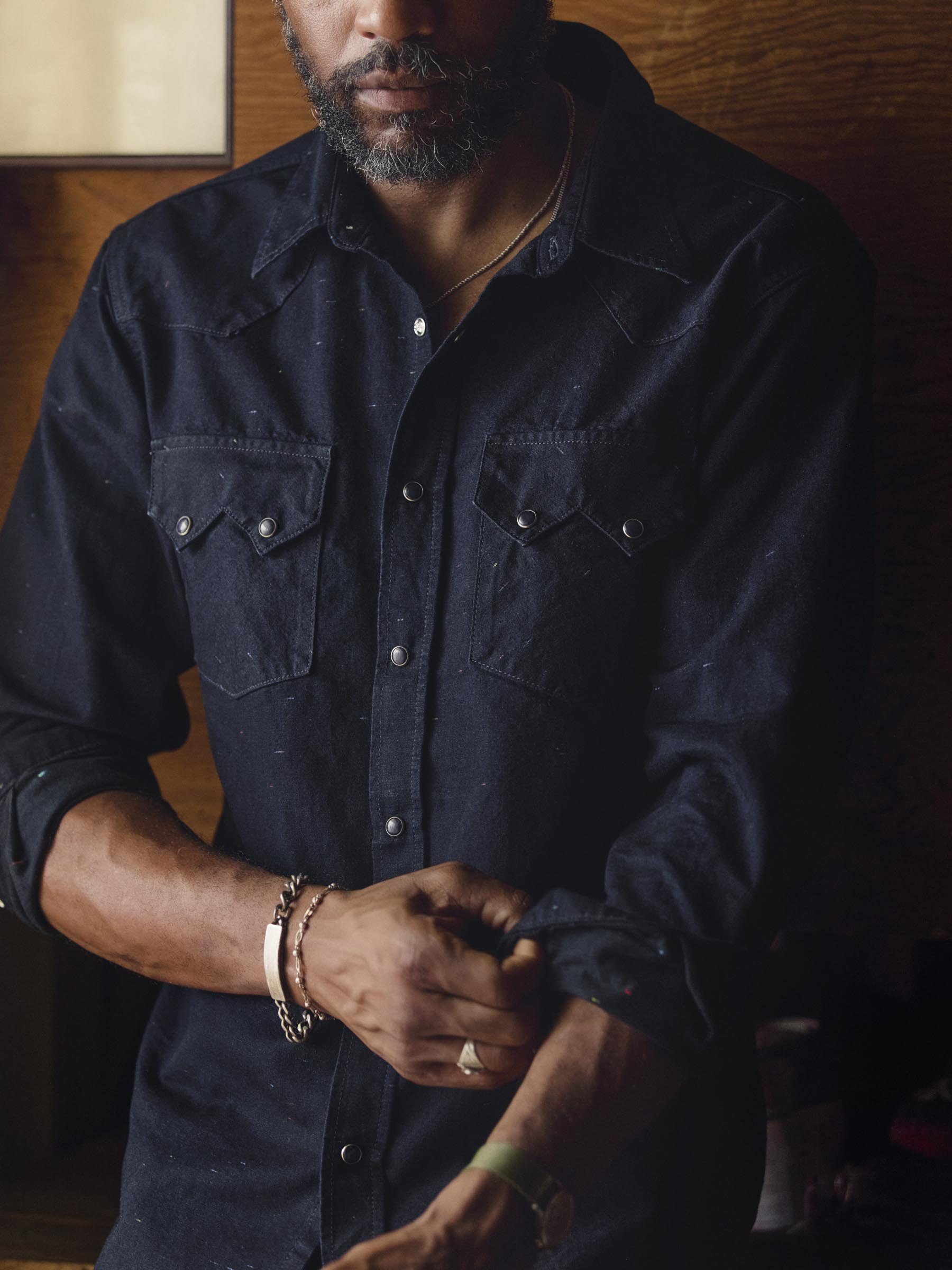 sawtooth pearl snap in reverse black indigo nep