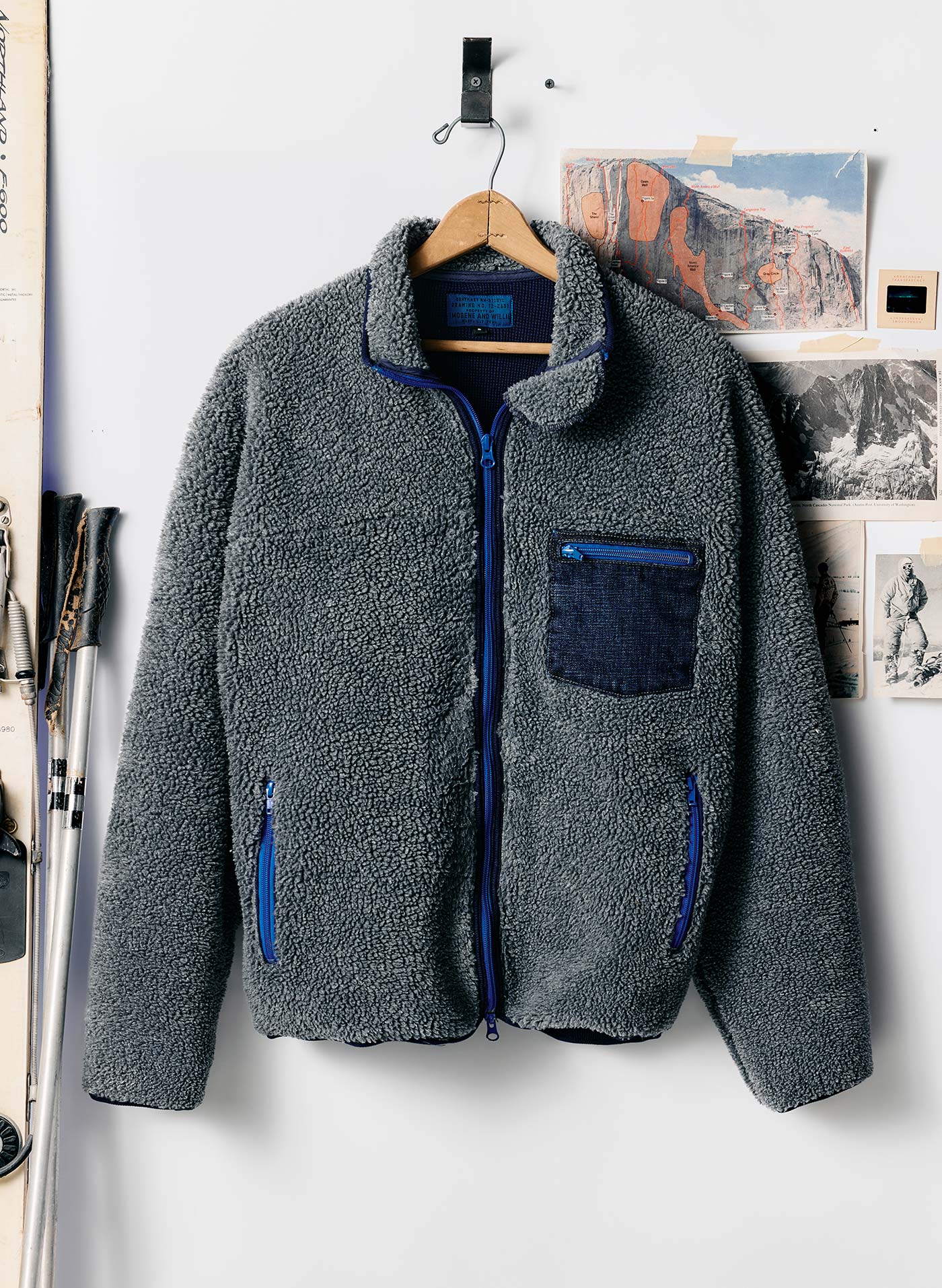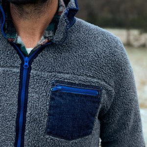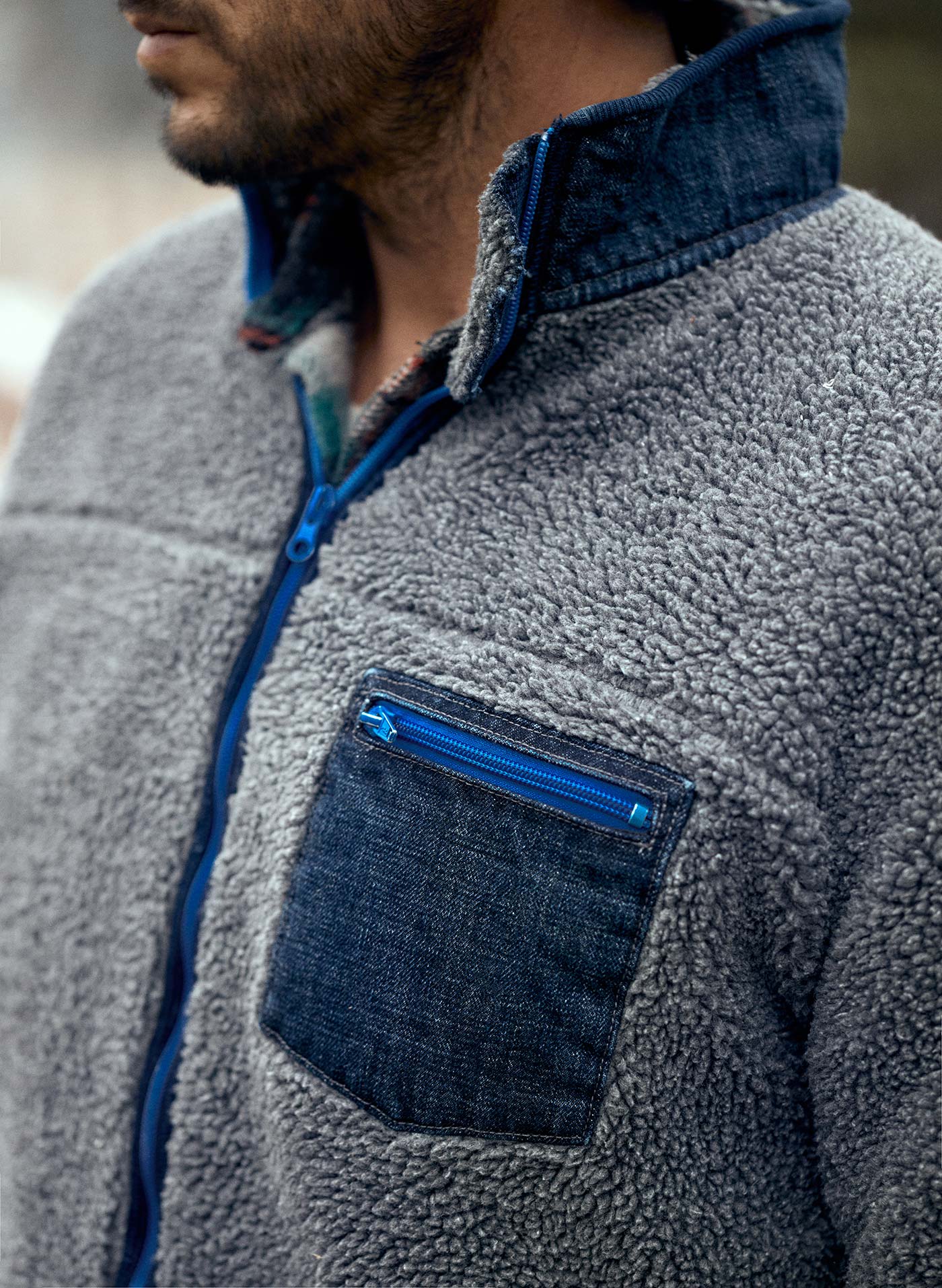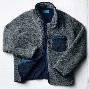 for the pocket and collar. we used the same rigid denim that’s in our core lineup of selvage jeans. as for the lining. the same waffle fabric we’ve featured in our thermals for years. and a binding made from the same indigo rib we’ve used for countless other pieces.